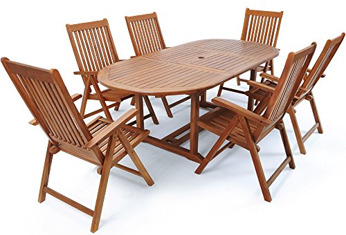 Durch das Butterfly-System können Sie den Tisch verlängern. So können Sie auch mit größeren Gruppen gemeinsam am Tisch sitzen. In der Mitte der Tischplatte befindet sich eine Halterung für Ihren Sonnenschirm. 9-strebige Sitzflächen und 8-strebige Rückenfläche an den Stühlen sorgen für die notwendige Stabilität. Die Stühle sind außerdem nach hinten in 5 Positionen verstellbar.