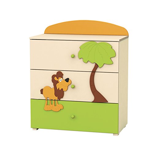 Über diese Ordnung wacht ein fröhlicher afrikanischer Löwe. Die Kommode der Kollektion AFRICA ist nicht nur praktisch, sondern auch sehr schön. Dank der schönen warmen Farbtöne gestaltet sich das Kinderzimmer Ihres kleinen Knirpses noch fröhlicher und gemütlicher.