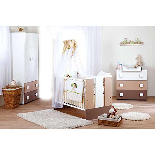 Ein großer Vorteil ist, dass die Möbel sich ideal an Ihre und an die Bedürfnisse Ihres Kindes anpassen lassen. Die Kommode wird ergänzt durch einen abnehmbaren Wickelaufsatz und wird somit zur perfekten Wickelkommode. Das Bettchen verfügt über herausnehmbare Schlupfsprossen, durch die ältere Kinder bereits selbständig aus dem Bettchen krabbeln können.